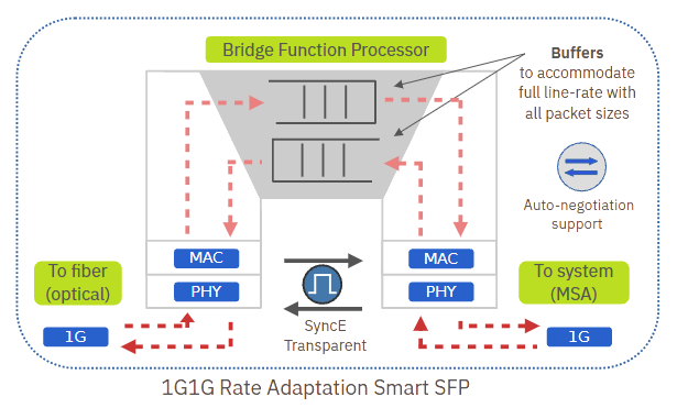 Internally the 1G1G Rate Adaptation Smart SFP™ uses a 1G bridge function processor to add functionality like auto-negotation.